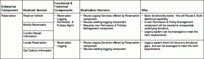 Service Realization Decisions are associated with service components. Each service component can be considered a container of functionality that is needed to realize a service. It is composed of or uses both functional and technical components. It is important to decide how these service components will be realized. It is not a simple "buy or build" decision. There are other considerations that need to be looked at such as: